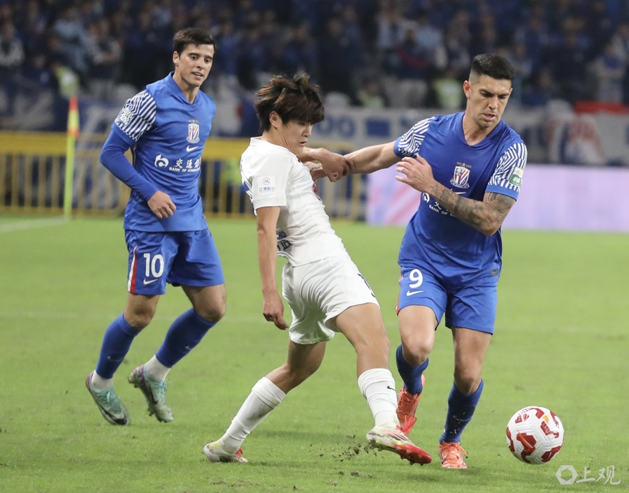 路易斯(右一)与对方球员拼抢 新民晚报 张龙 摄