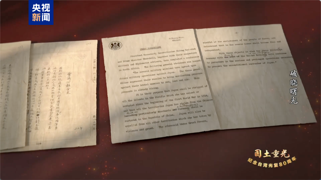 1943年12月1日,中、美、英三国共同发表《开罗宣言》,正式宣告:三国之宗旨,在剥夺日本自从1914年第一次世界大战开始后,在太平洋上所夺得或占领之一切岛屿,在使日本所窃取于中国之领土,例如东北四省、台湾、澎湖群岛等,归还中国。