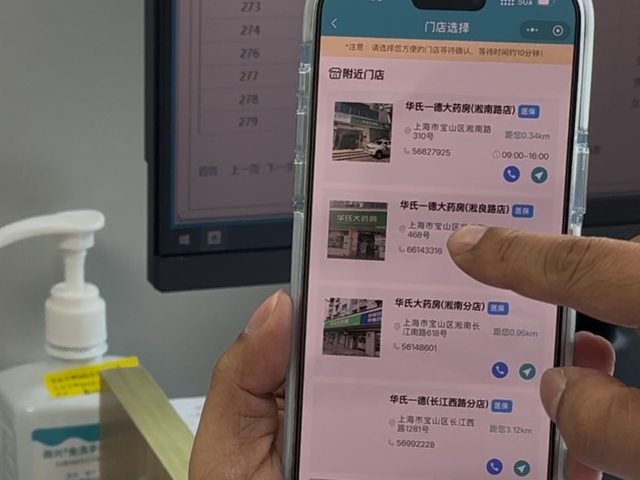 从淞南镇社区卫生服务中心出发,王老伯骑上电瓶车,不到5分钟就抵达了淞良路上的华氏一德大药房。手机上,“宝药通”小程序平台显示距离仅440米。“从社区医院回家,这家药房我一直经过的,拿好药再去旁边买点小菜,很方便。”
